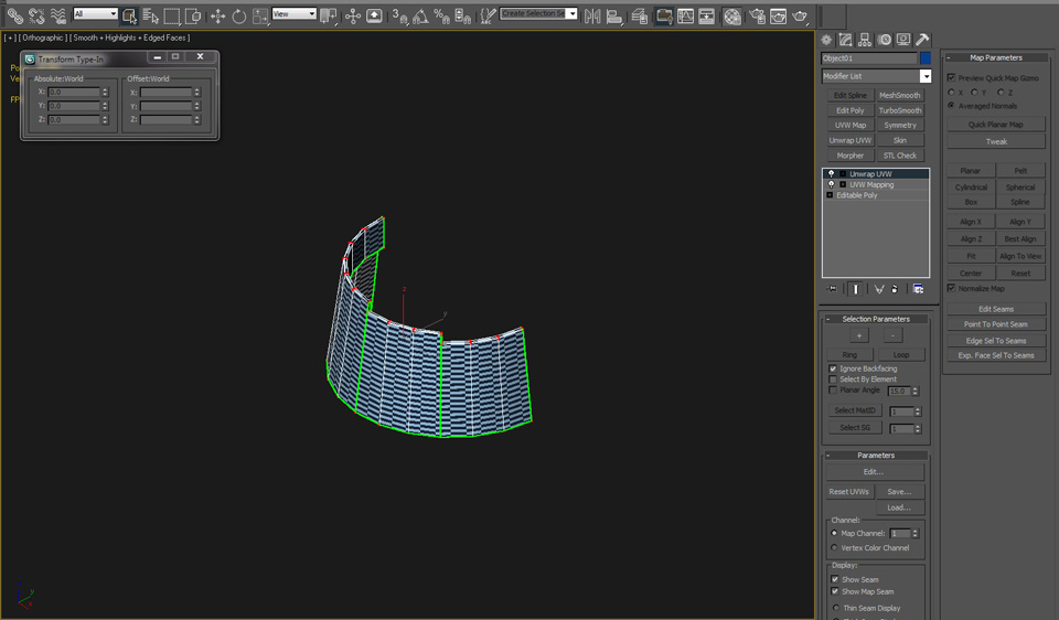 | With the object mapped you can now use the Tools/Render UVW Template to create an image that will serve as a GUIDE layer in Photoshop where you can assemble and paint your texture. In Photoshop, keep the UVWs as a top layer. Inverse the green on black to create a mostly white image, then blend as a Multiply layer. Or you can select all the black in the UVW image, and simply delete the black to reveal the green lines which can then be colored or darkened, and blended as needed. |
