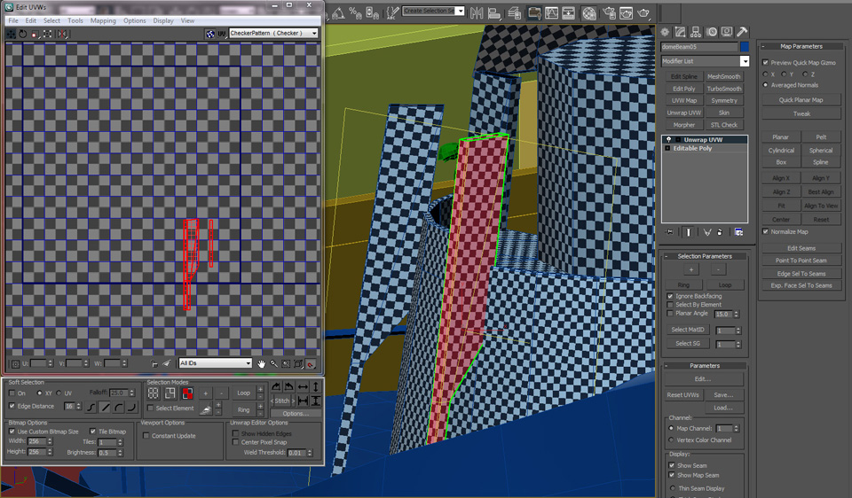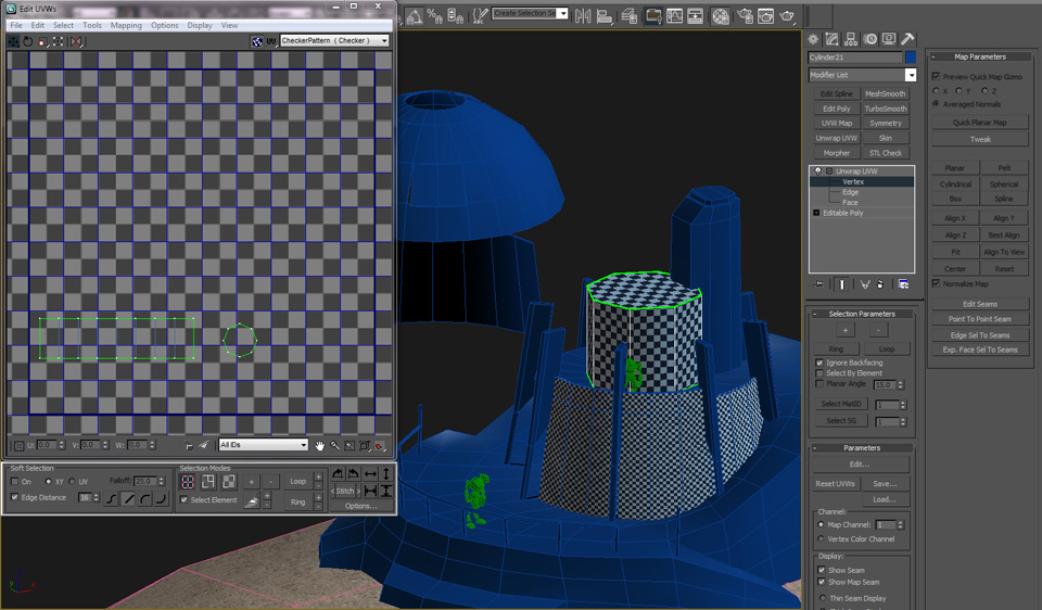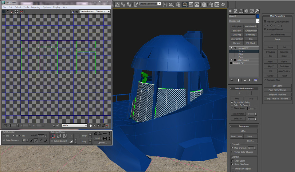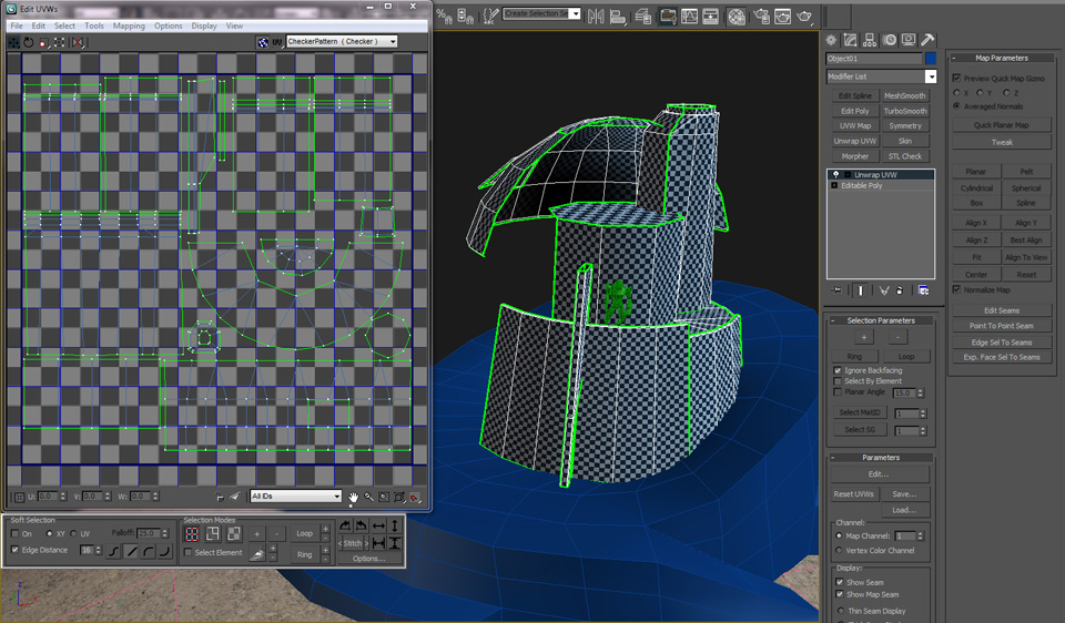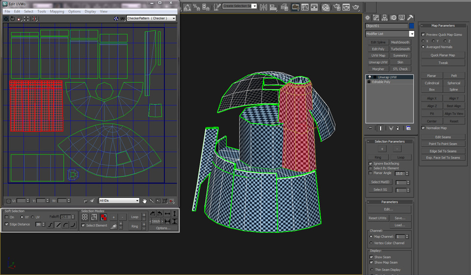 Once the UVs are assembled, continue to edit the UVs until the checker pattern is consistent and you are satisifed with the overall layout. Be sure to leave a little space between each group of UVs.
