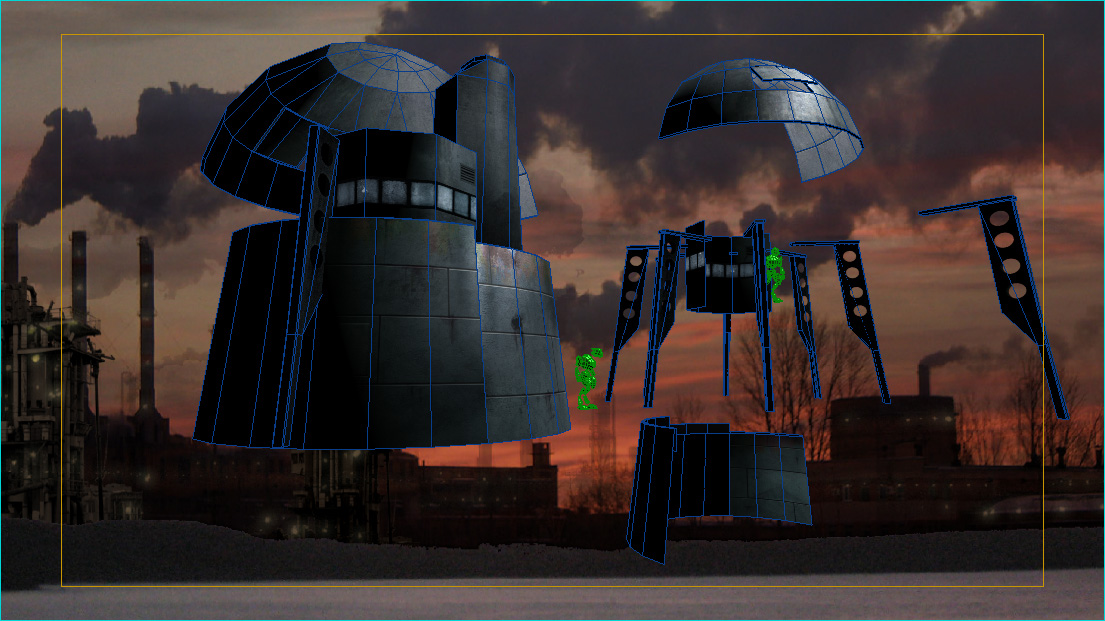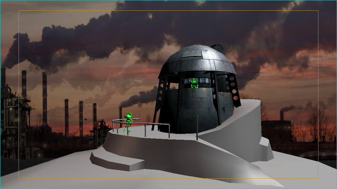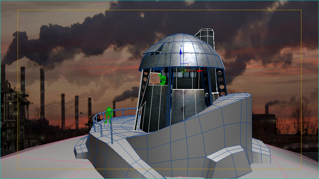This is a real time view of the current dome building. This is a screen grab and not a render. The material on the building is a 3 point light fx shader. Link to Laurens Corijn Viewport Shader. The background is a combination of images composited to help stage the scene and sell the industrial nature of the building. The aliens are meant to be a little bigger than humans.